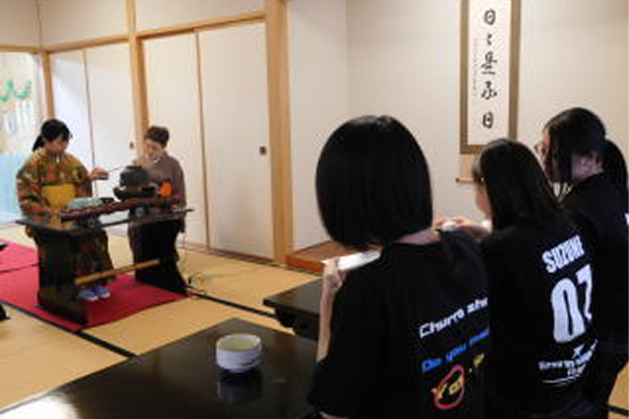 茶道部は部員全員が真剣に部活動に取り組んでいます。茶道では準備や片づけがとても大切なのですが、自分達で積極的に行い、始めから終りまでスムーズに活動できています。普段の活動は、お点前と水屋、お客さんに分かれて実習します。お点前では、講師の松永先生に来て頂き、一人ずつ丁寧にわかりやすく教えて下さいます。水屋はお菓子を運んだり、お茶を点てたりします。お客さんはお菓子やお茶を頂きます。最初は覚えるのが大変ですが、だんだんと上達していきます。焼高祭のときは、作法室でお茶会をします。手軽にお茶やお菓子を召し上がっていただけるので好評です。これからも日々の練習に励み、みんなで楽しく部活動をしていきたいと思います。